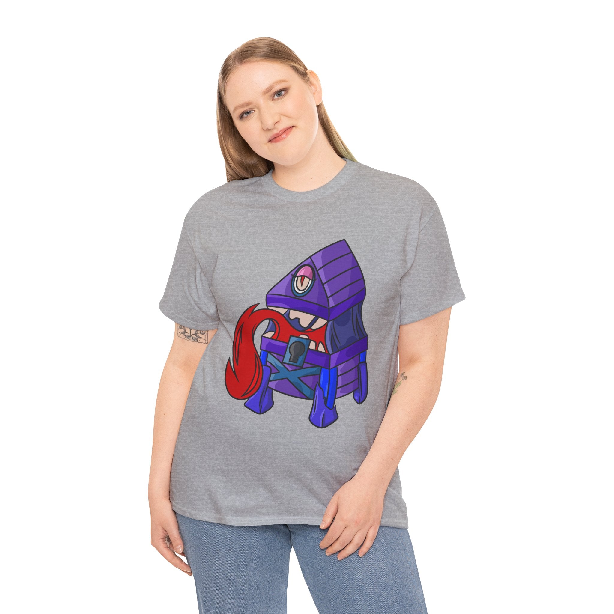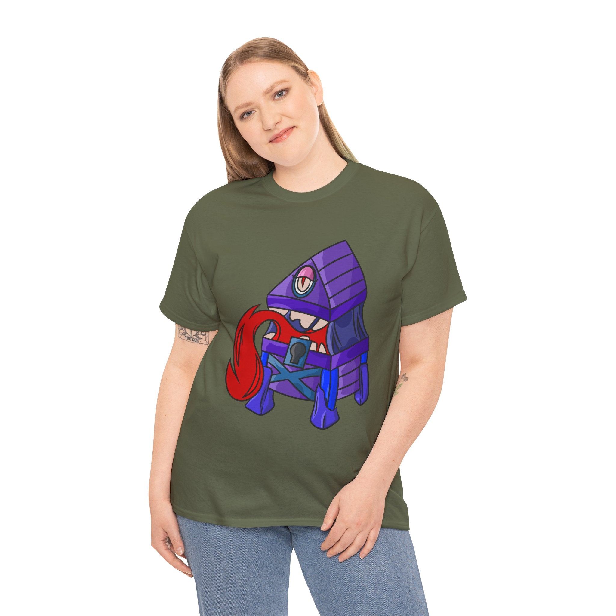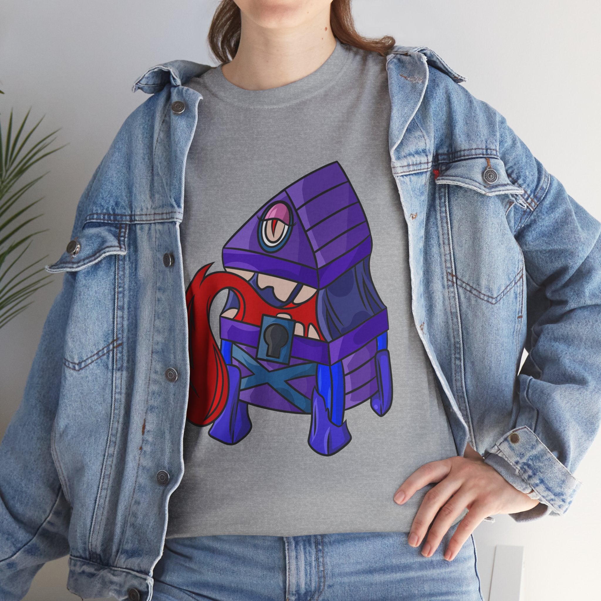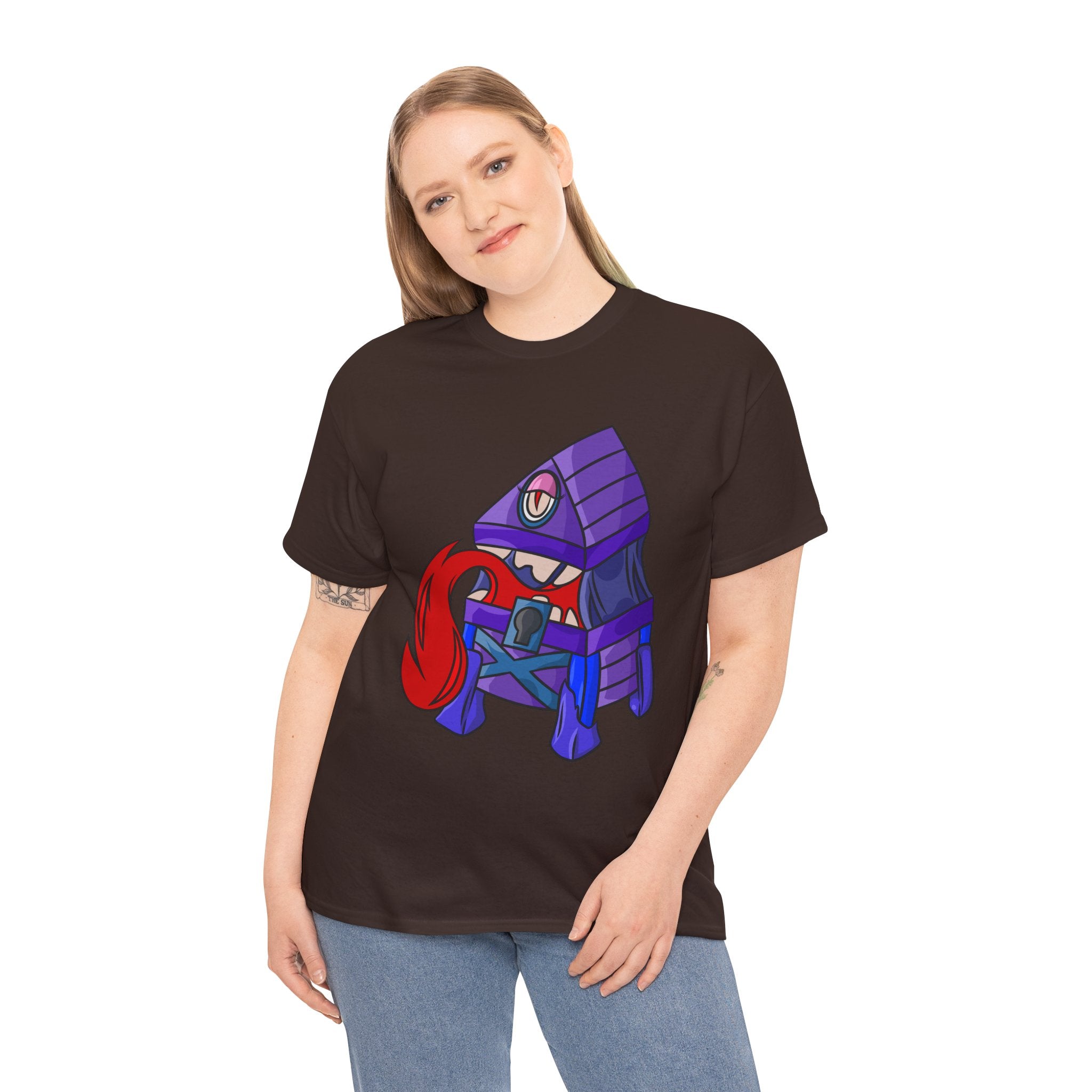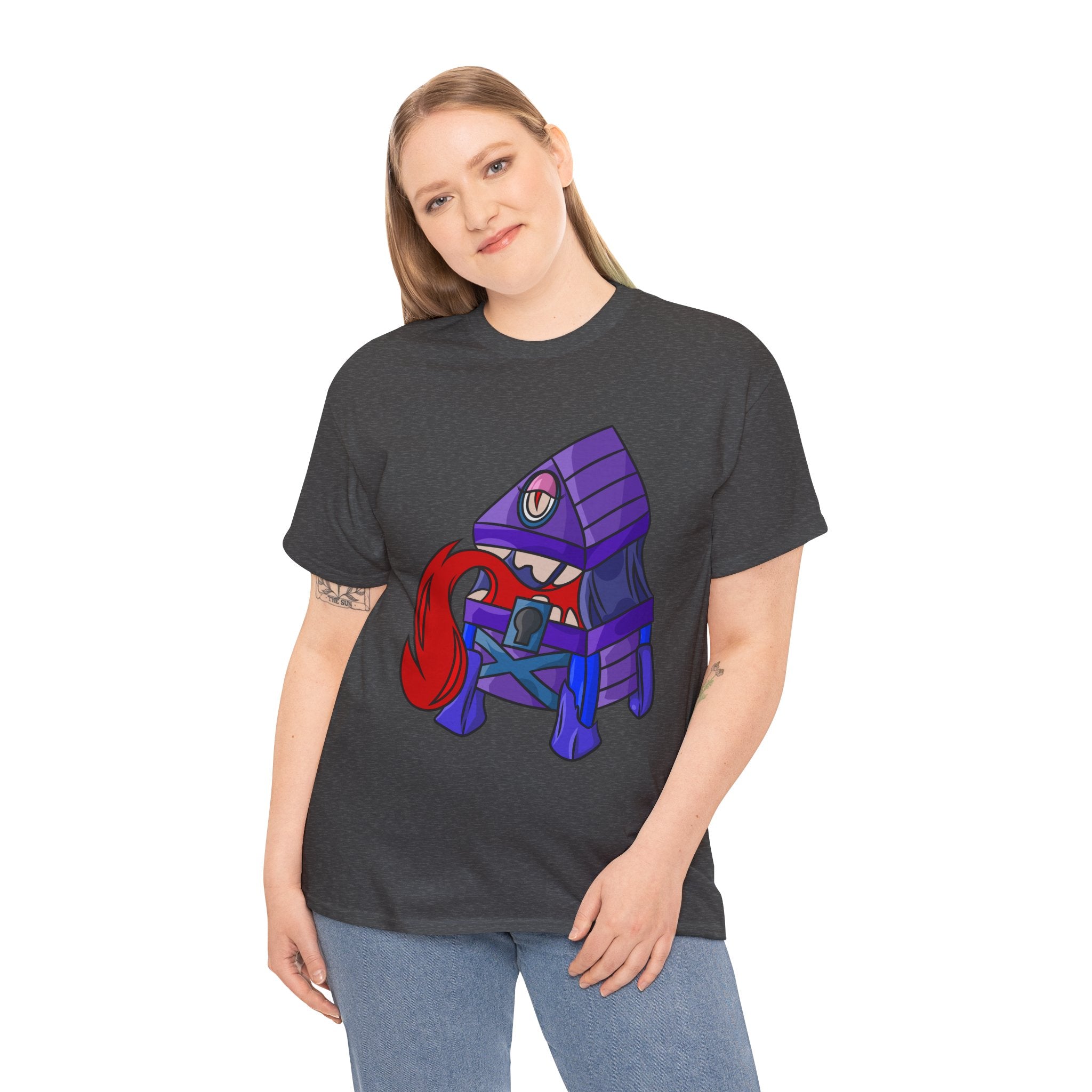 Minnie the Mimic is a playful, slightly spooky tee that brings dungeon humor to everyday wear. Imagine a small, loveable mimic — all toothy grin and curious tongue — waiting in the shadows of a tabletop session or tucked into the corner of a game night. This shirt’s artwork leans into affectionate menace: mischievous eyes, a licking tongue, and a pose that reads more cheeky companion than monster. It slips easily into the wardrobe of roleplayers, dungeon masters, and fantasy fans who enjoy a wink of dark whimsy. Soft, sturdy cotton and a smooth print give the design the pop it needs while keeping the shirt wearable from one session to the next. Throw it on for a late-night campaign, a convention meetup, or when you want a small, nerdy charm that announces your sense of humor without shouting.