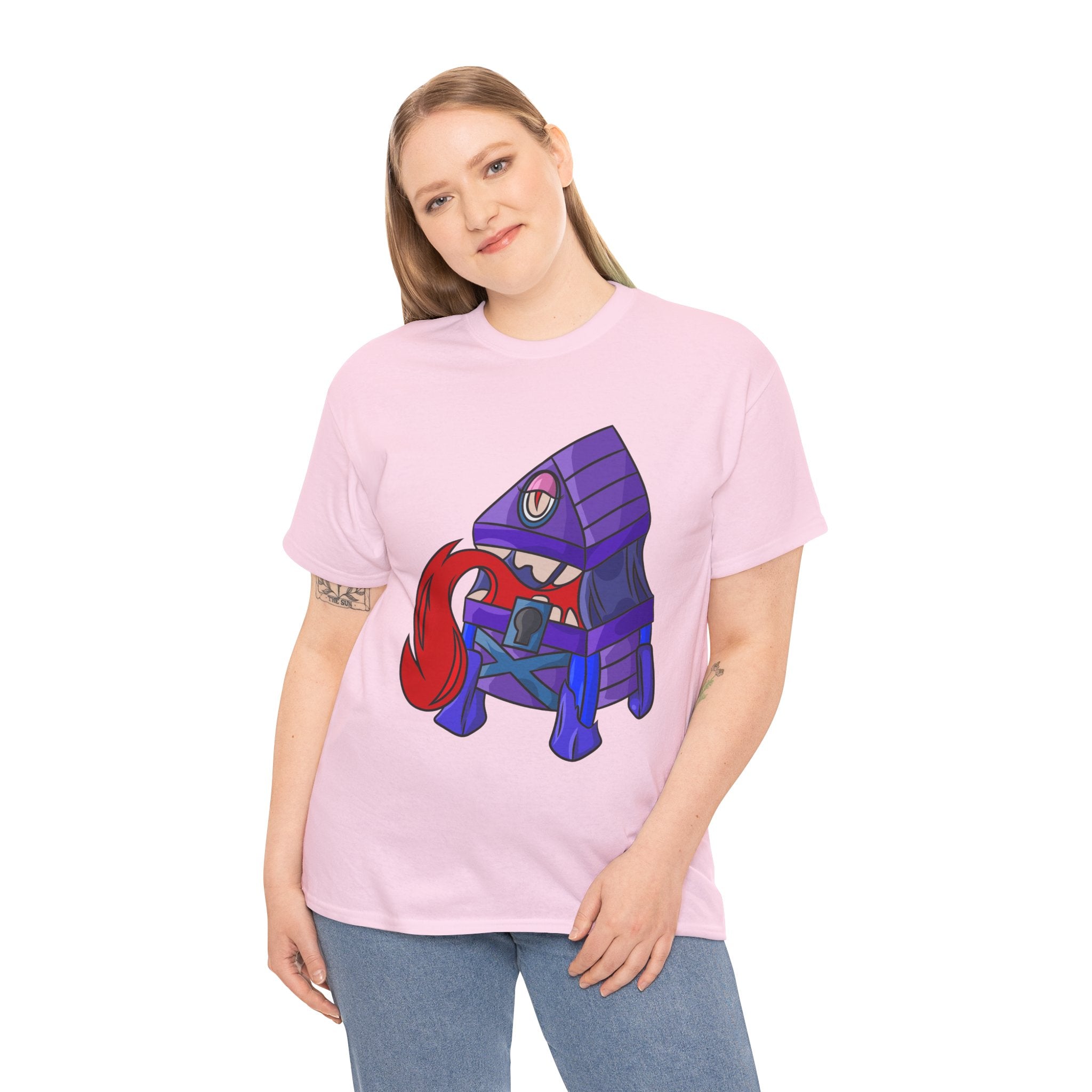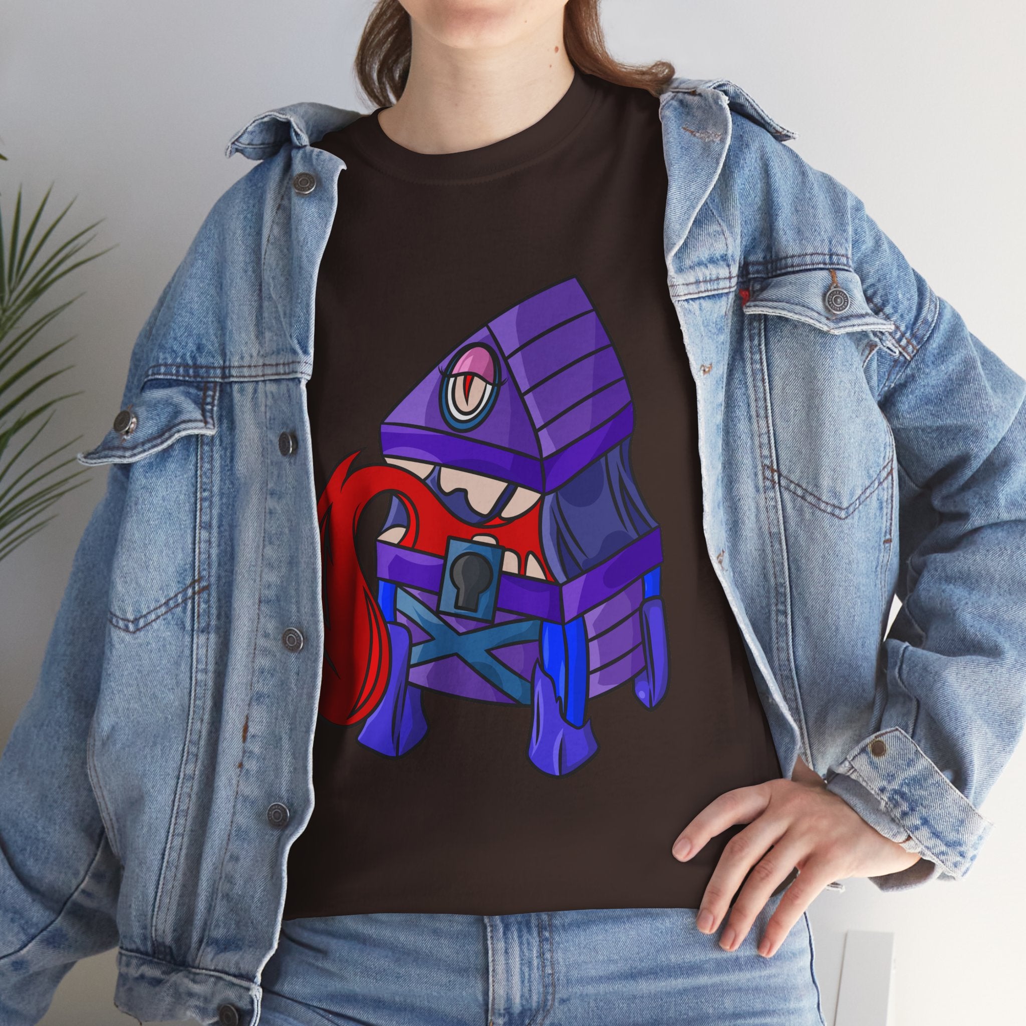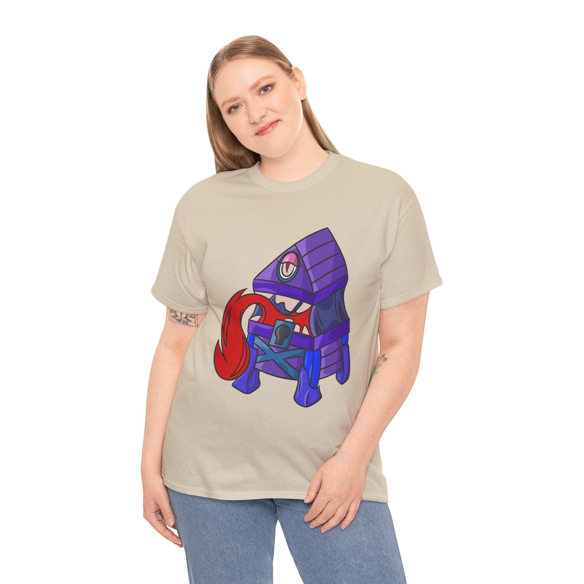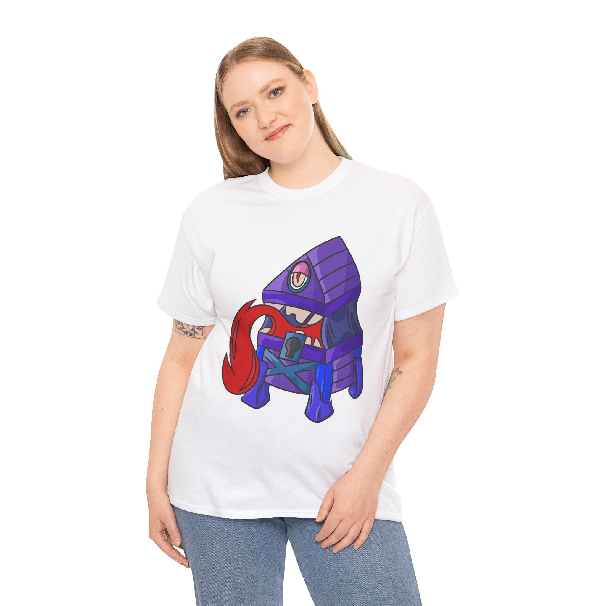 Minnie the Mimic is a playful, slightly spooky tee that brings dungeon humor to everyday wear. Imagine a small, loveable mimic — all toothy grin and curious tongue — waiting in the shadows of a tabletop session or tucked into the corner of a game night. This shirt’s artwork leans into affectionate menace: mischievous eyes, a licking tongue, and a pose that reads more cheeky companion than monster. It slips easily into the wardrobe of roleplayers, dungeon masters, and fantasy fans who enjoy a wink of dark whimsy. Soft, sturdy cotton and a smooth print give the design the pop it needs while keeping the shirt wearable from one session to the next. Throw it on for a late-night campaign, a convention meetup, or when you want a small, nerdy charm that announces your sense of humor without shouting.