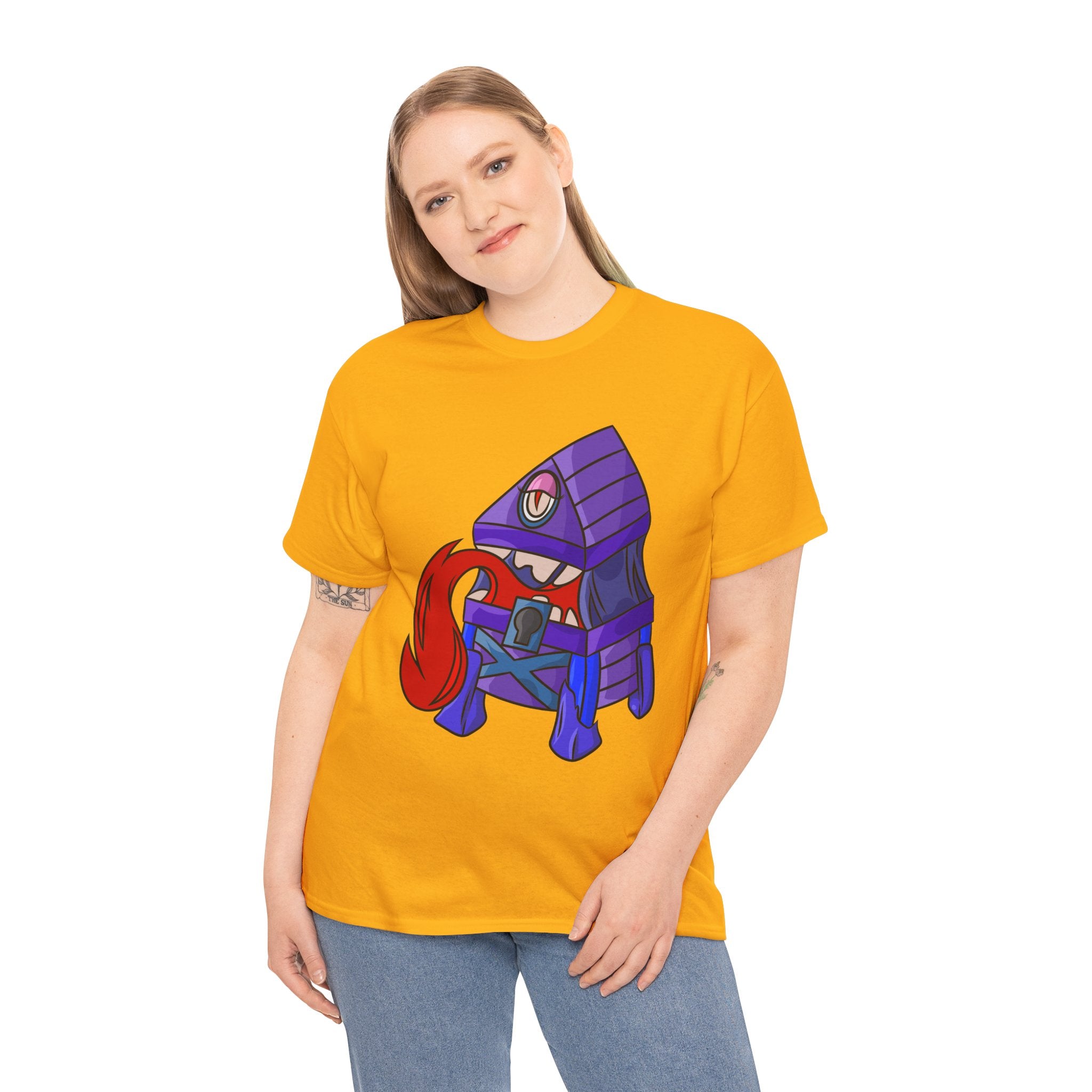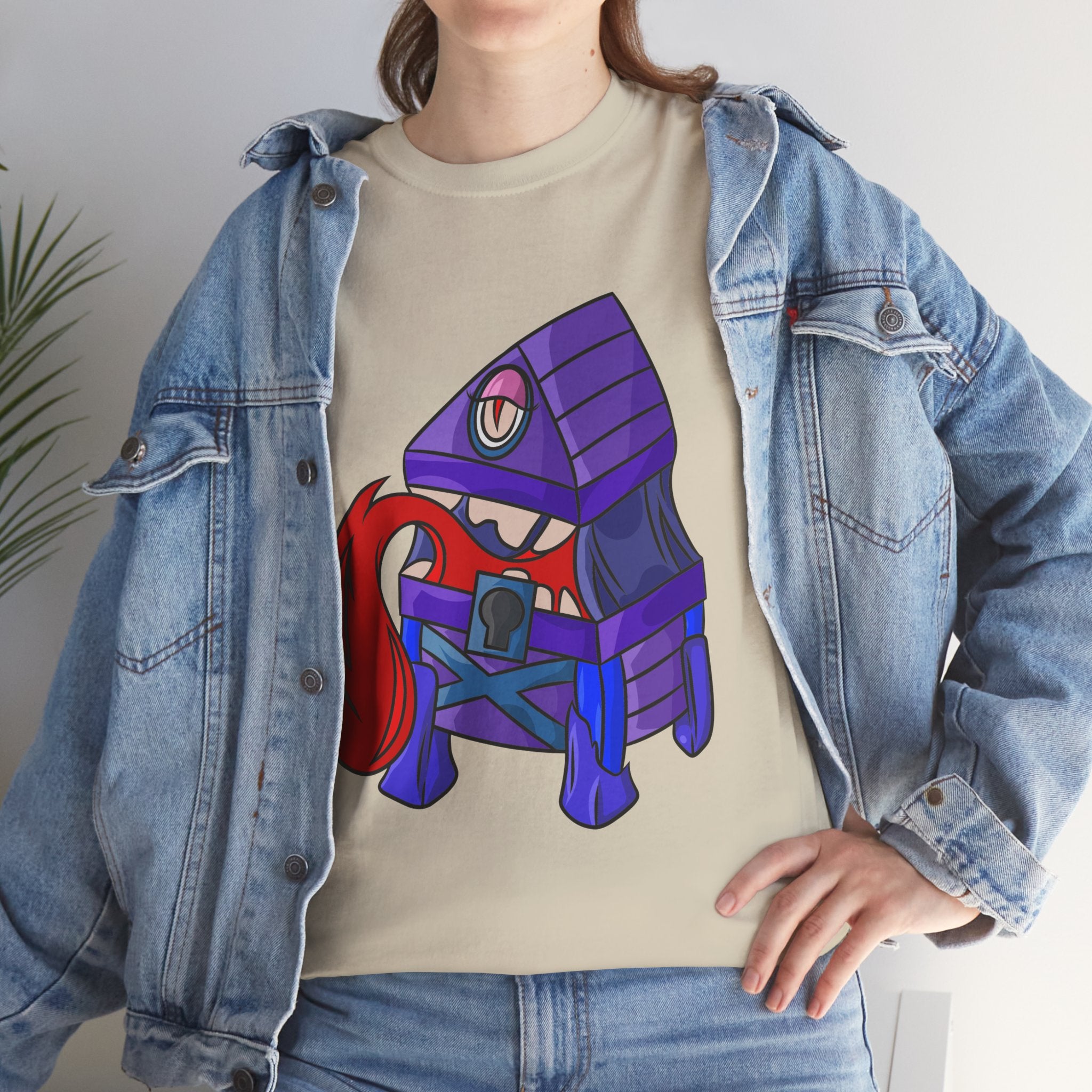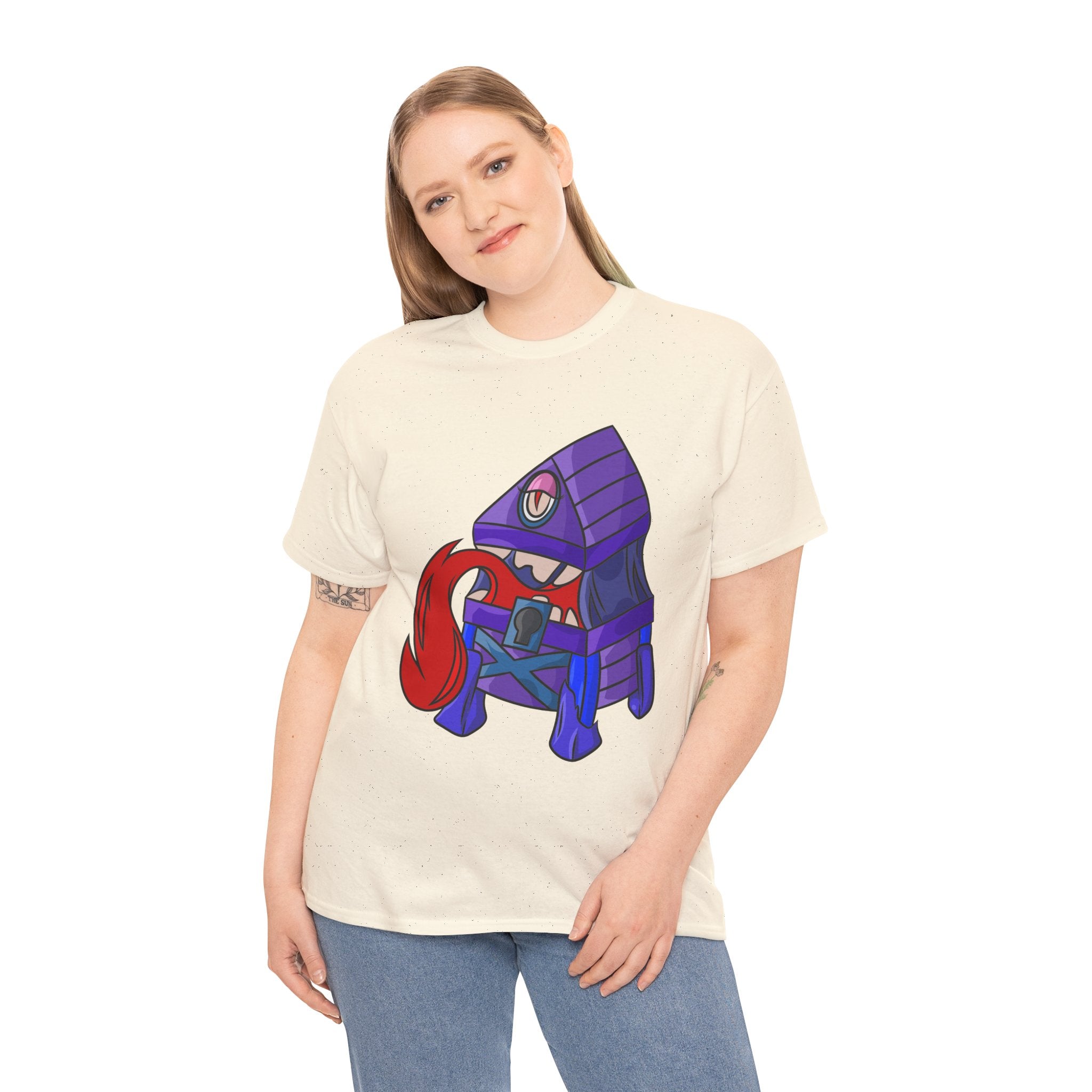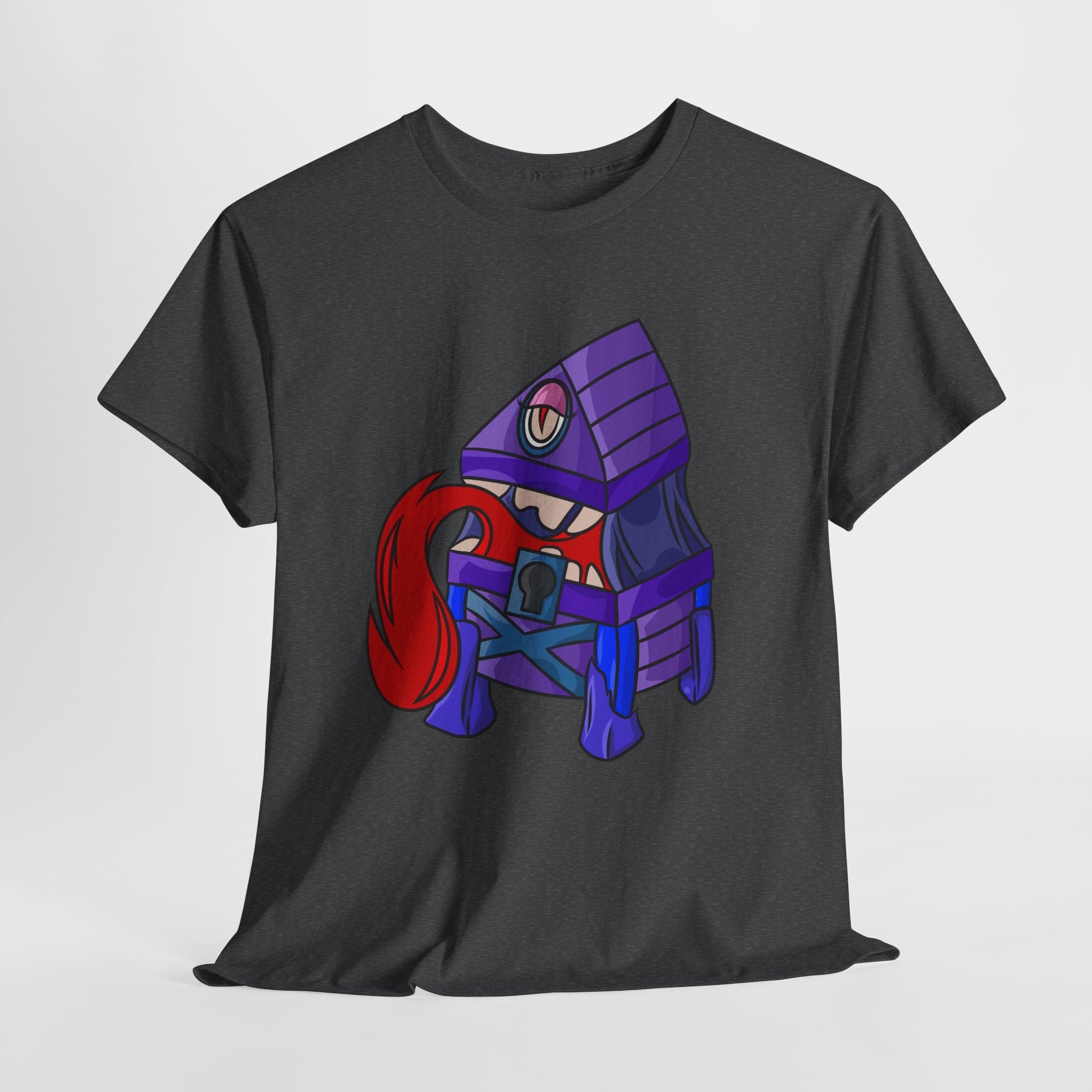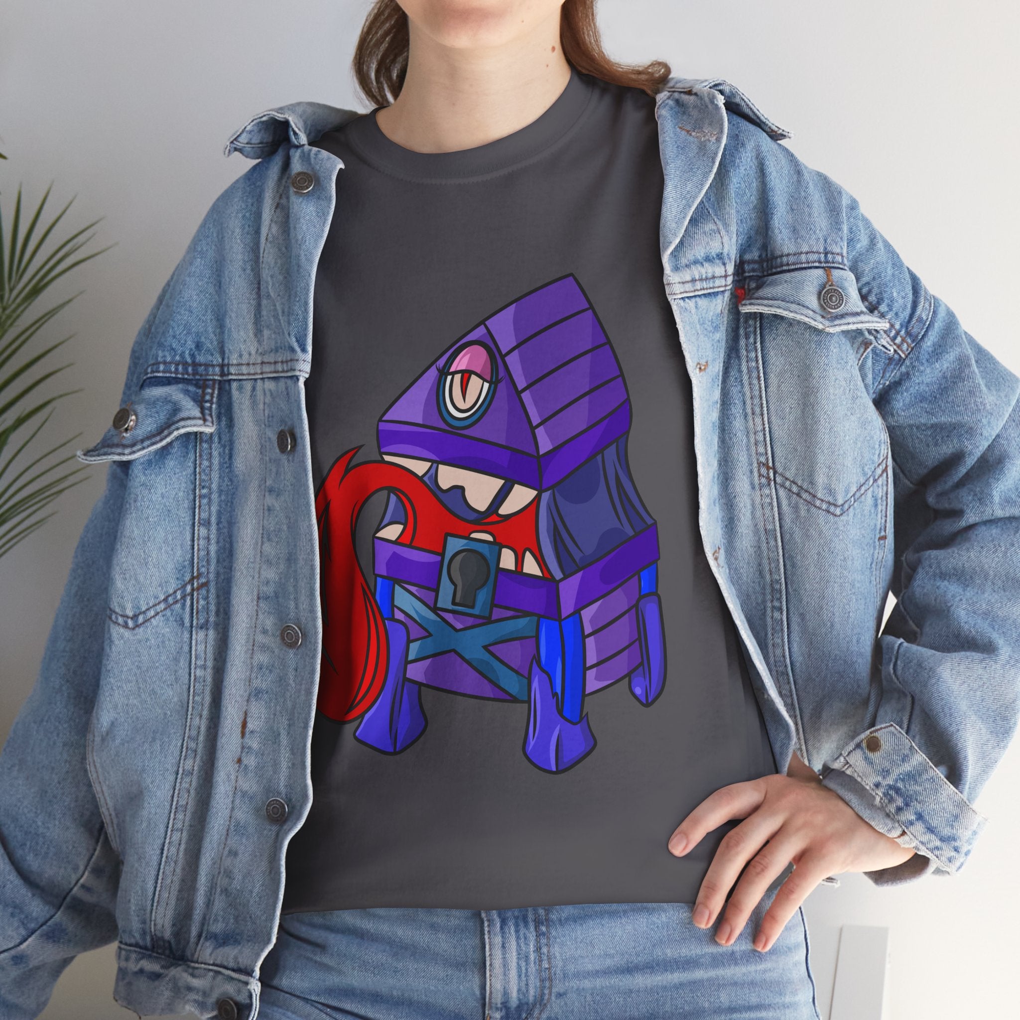 Minnie the Mimic is a playful, slightly spooky tee that brings dungeon humor to everyday wear. Imagine a small, loveable mimic — all toothy grin and curious tongue — waiting in the shadows of a tabletop session or tucked into the corner of a game night. This shirt’s artwork leans into affectionate menace: mischievous eyes, a licking tongue, and a pose that reads more cheeky companion than monster. It slips easily into the wardrobe of roleplayers, dungeon masters, and fantasy fans who enjoy a wink of dark whimsy. Soft, sturdy cotton and a smooth print give the design the pop it needs while keeping the shirt wearable from one session to the next. Throw it on for a late-night campaign, a convention meetup, or when you want a small, nerdy charm that announces your sense of humor without shouting.
