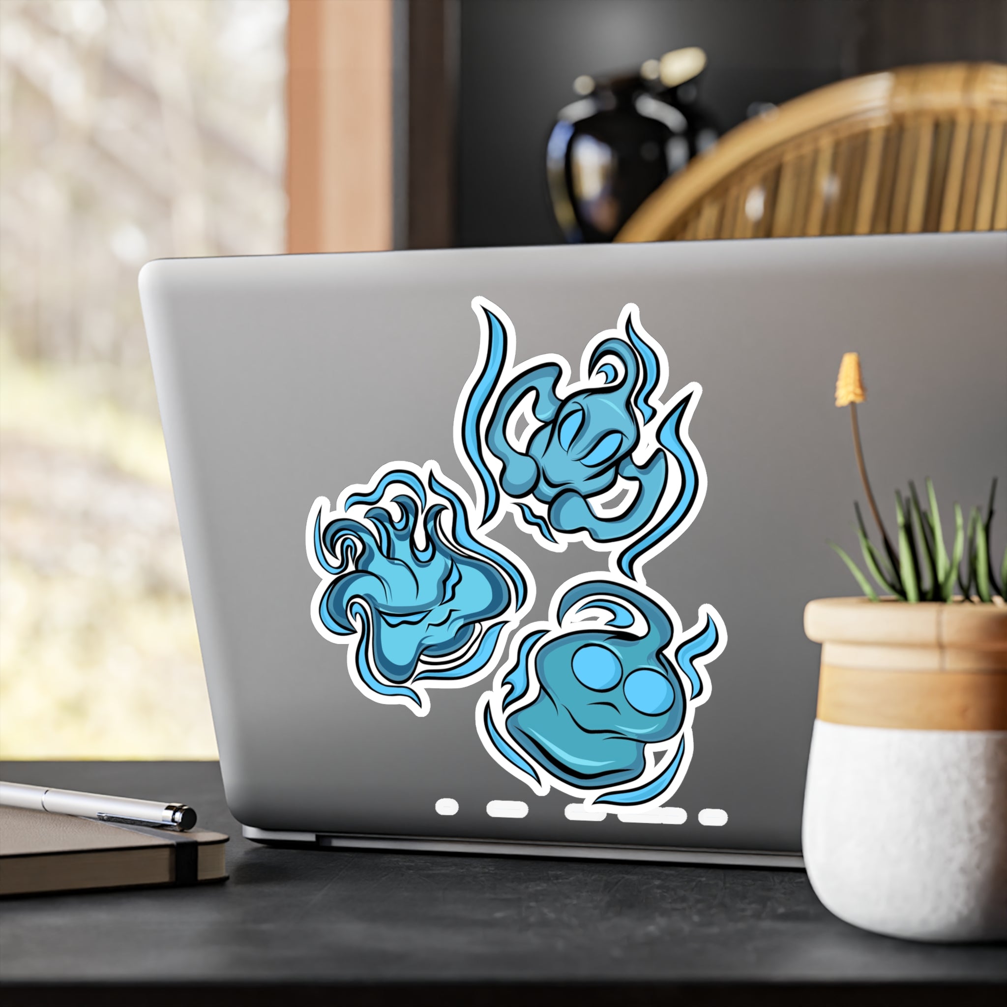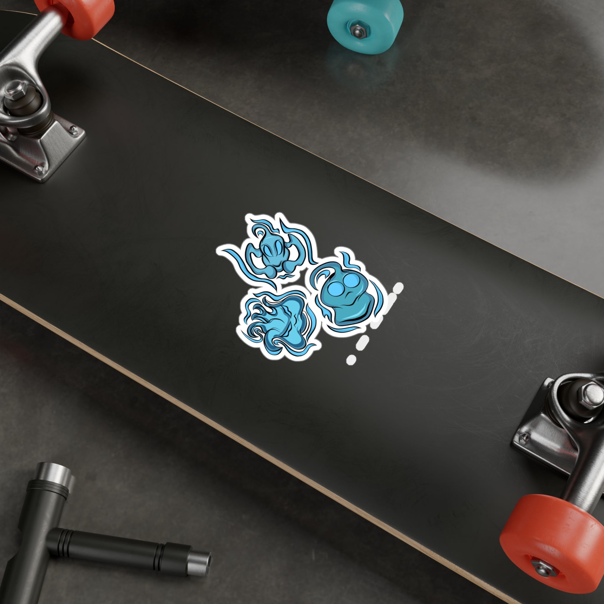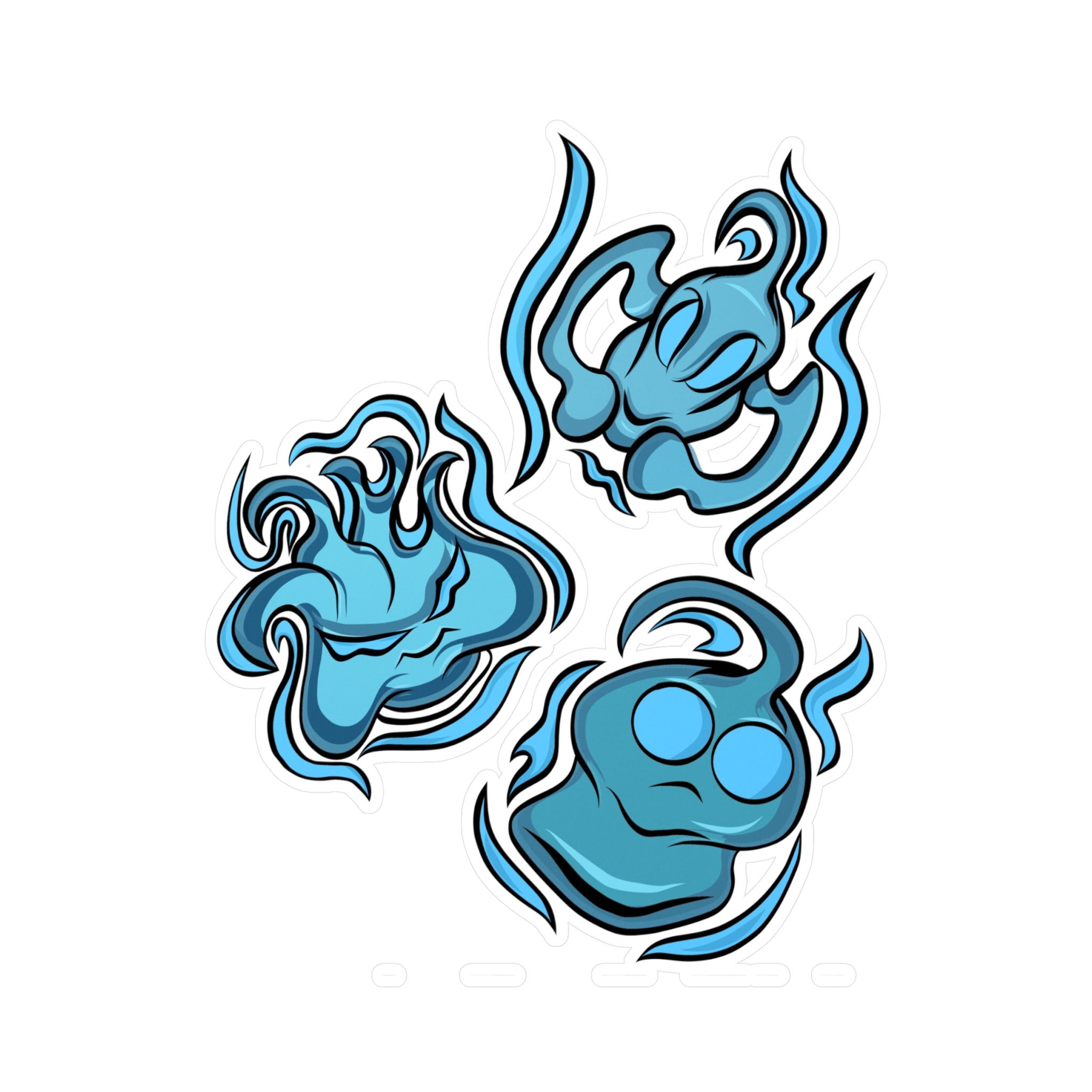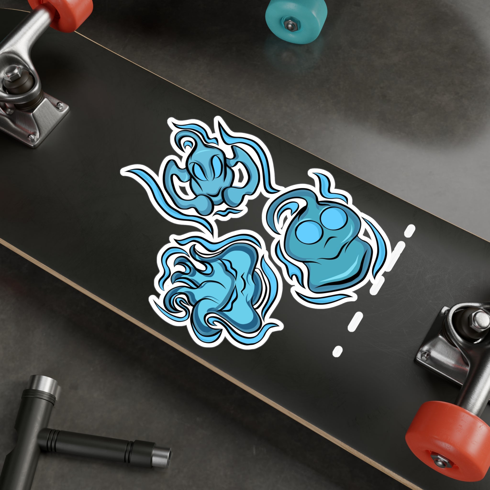Bright, playful vinyl decals showing three whimsical blue spirits in a loose, hand-drawn style. The satin-finish stickers carry bold, saturated...