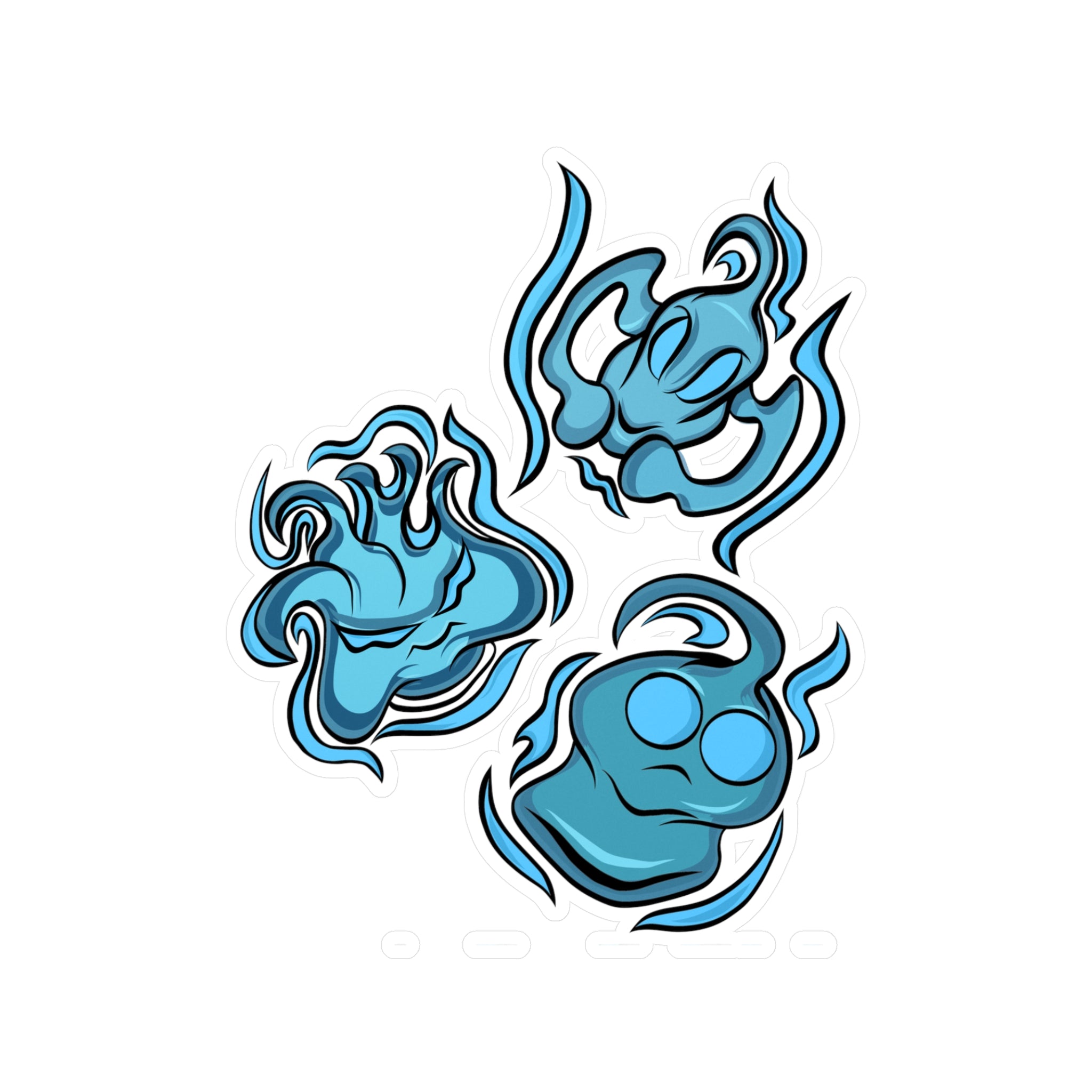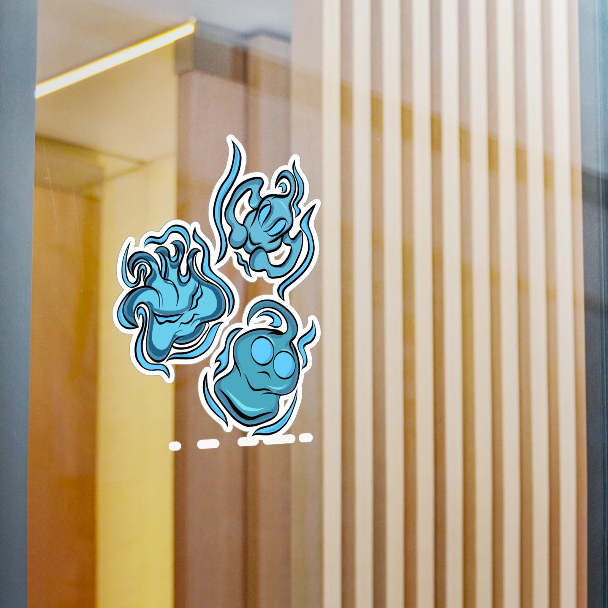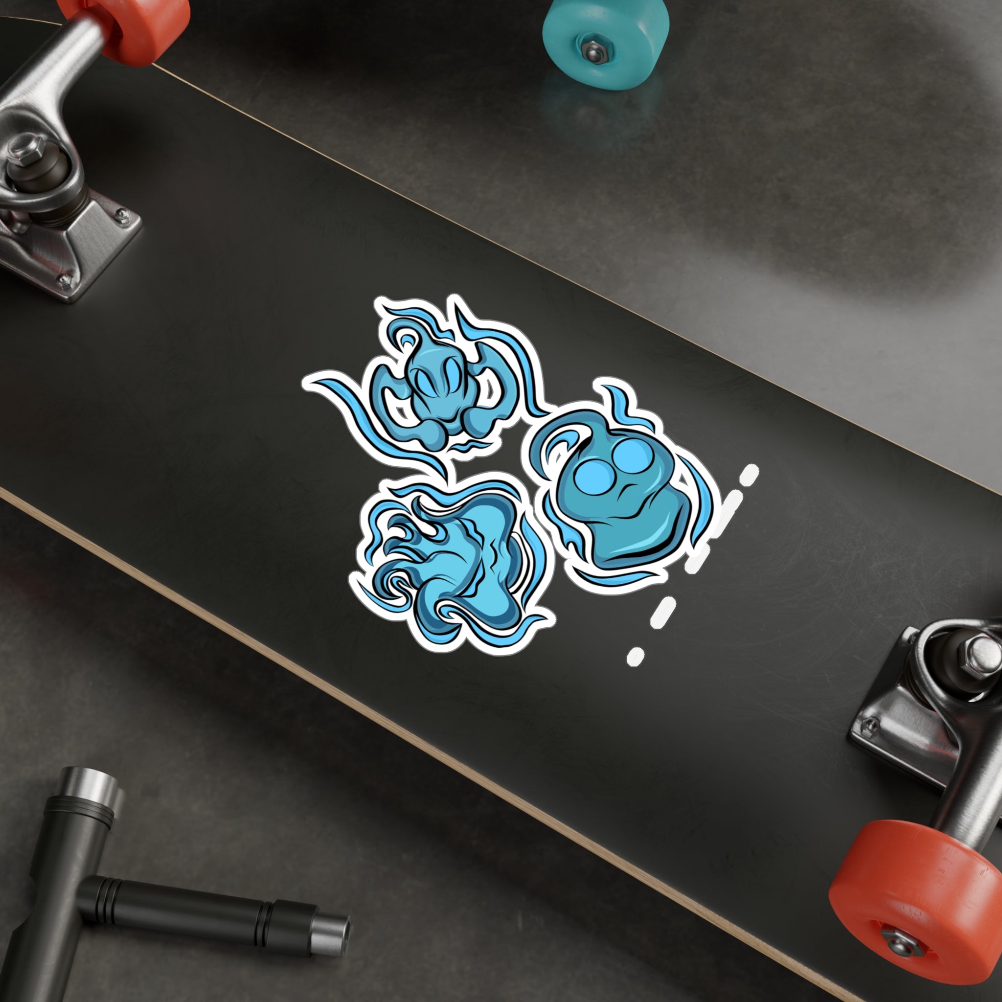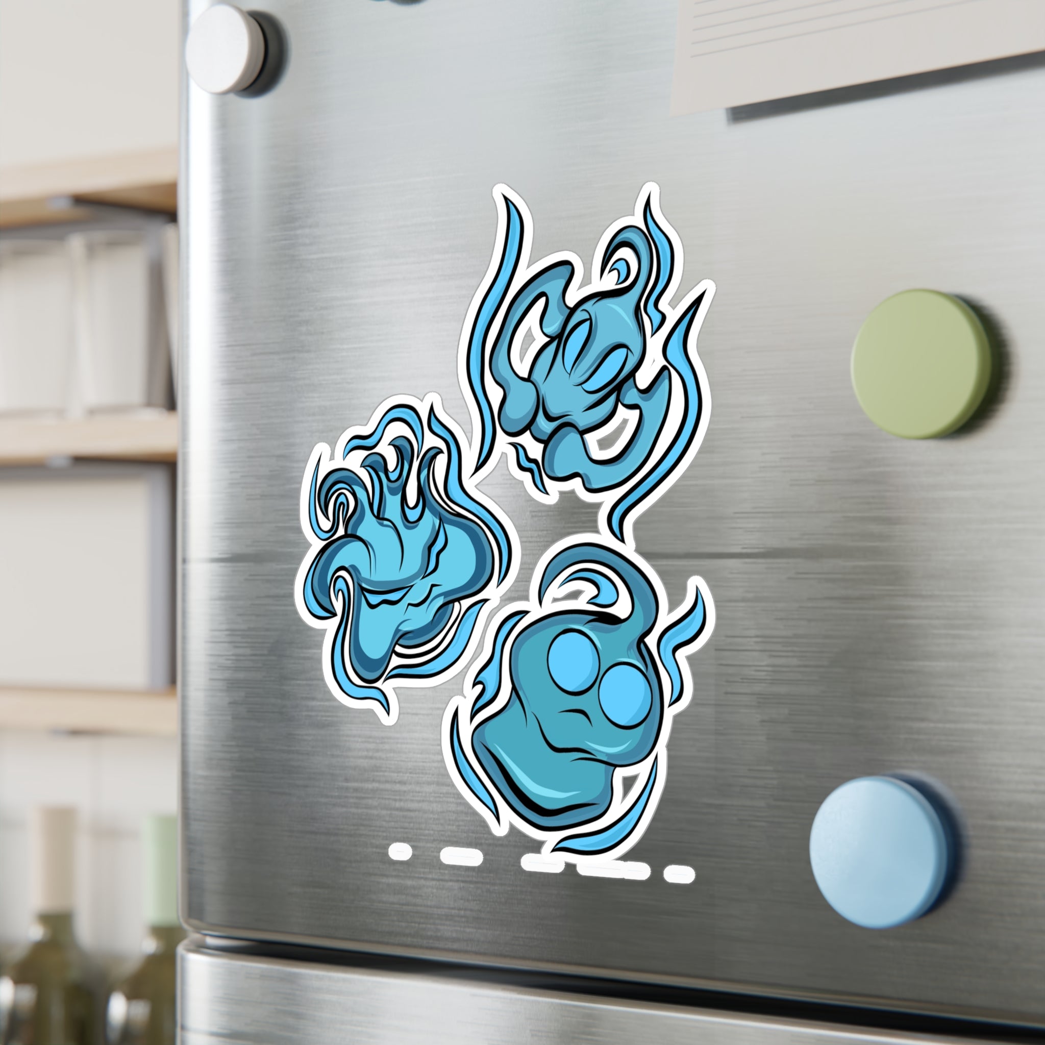 Bright, playful vinyl decals showing three whimsical blue spirits in a loose, hand-drawn style. The satin-finish stickers carry bold, saturated...