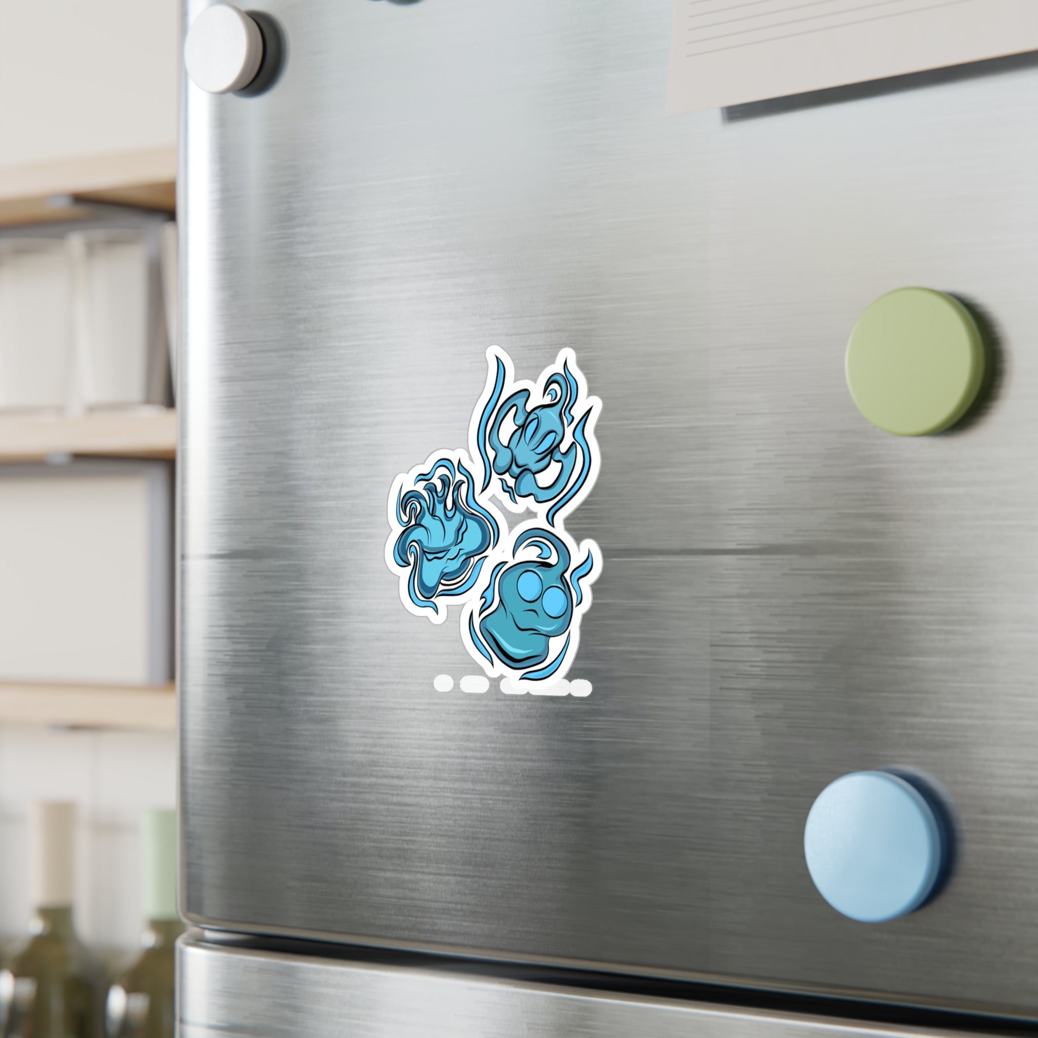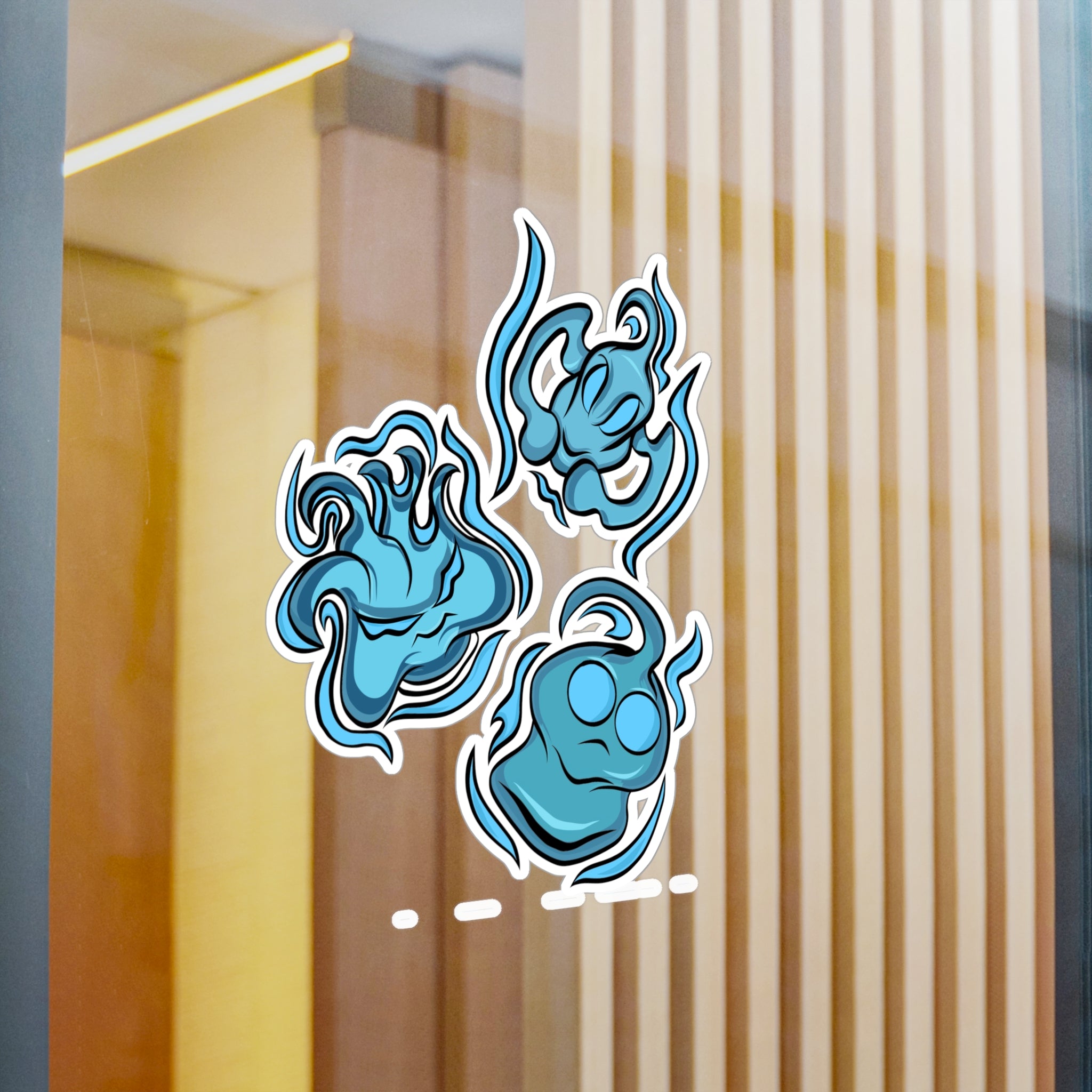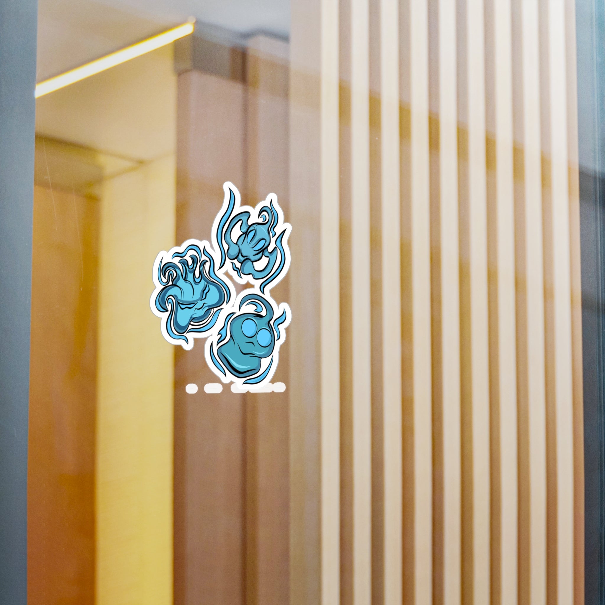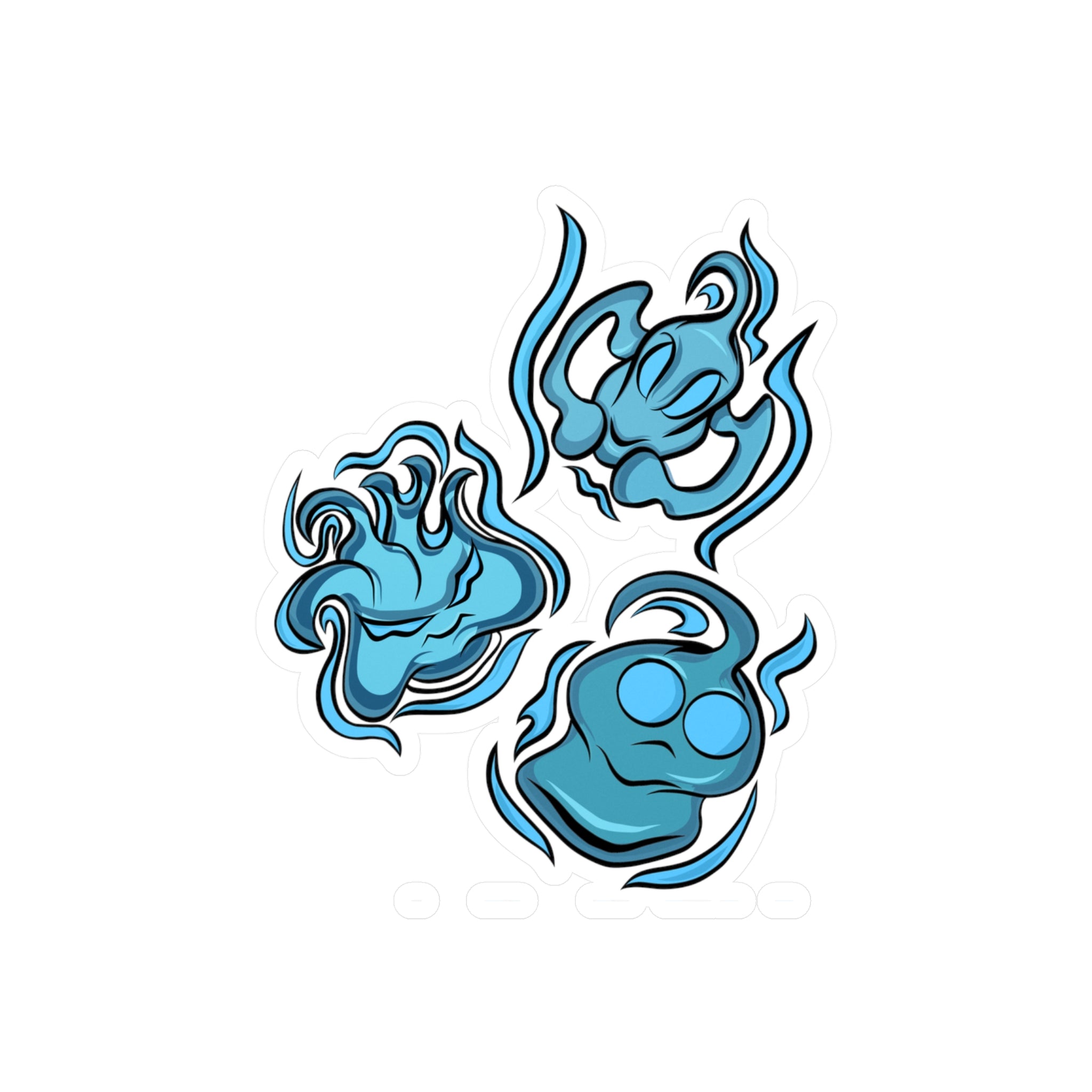 Bright, playful vinyl decals showing three whimsical blue spirits in a loose, hand-drawn style. The satin-finish stickers carry bold, saturated...