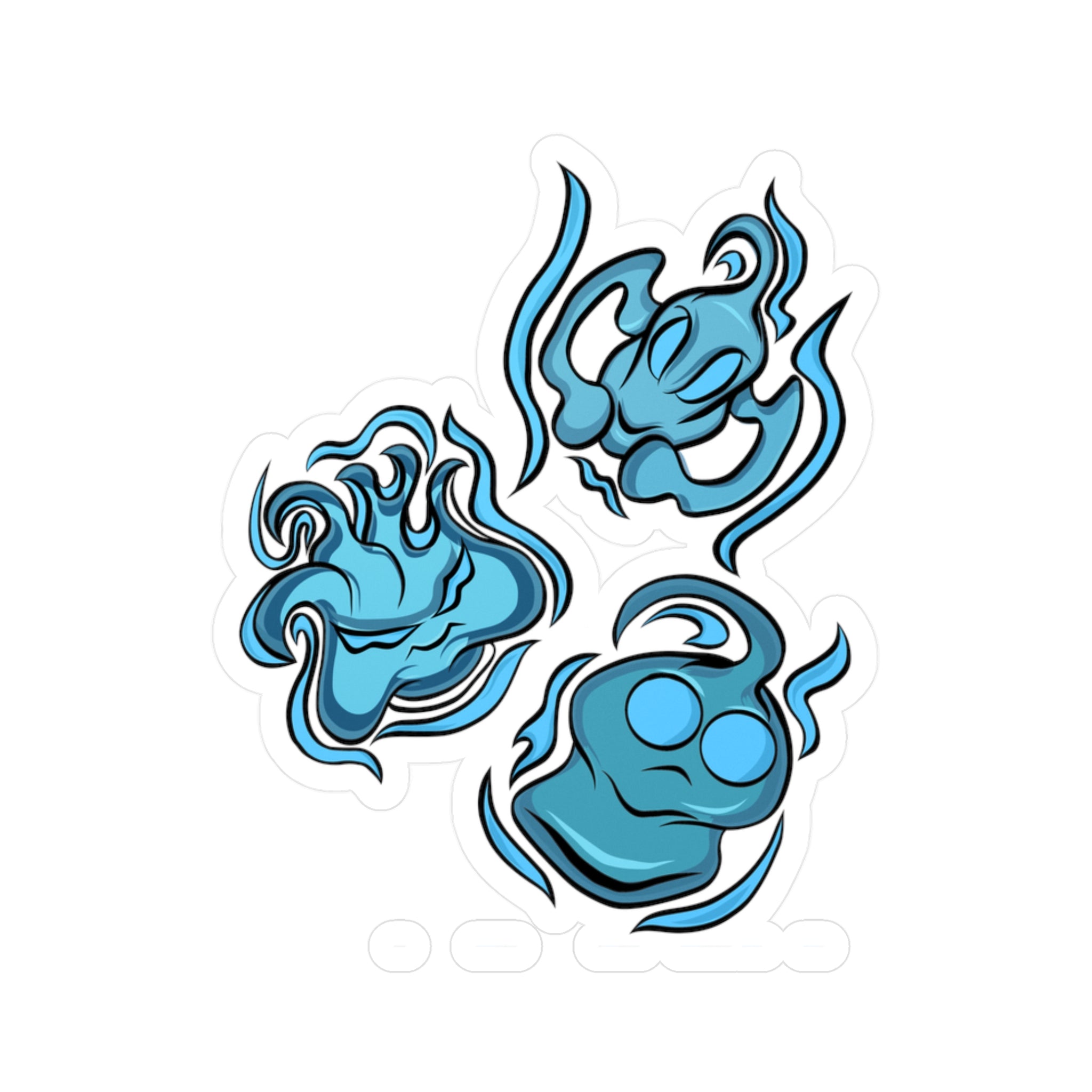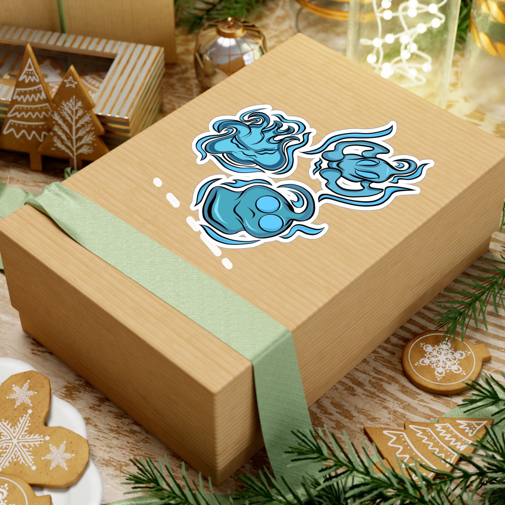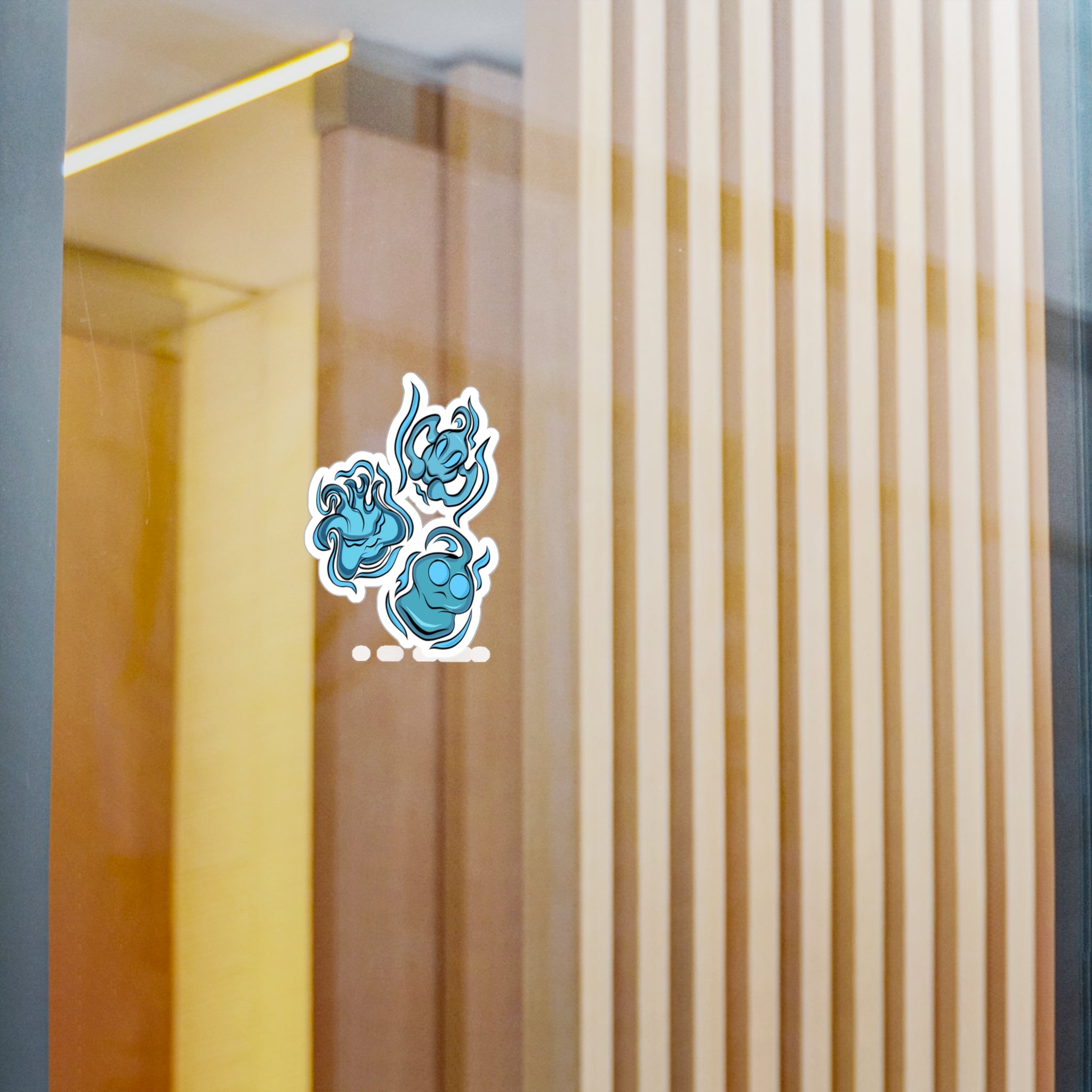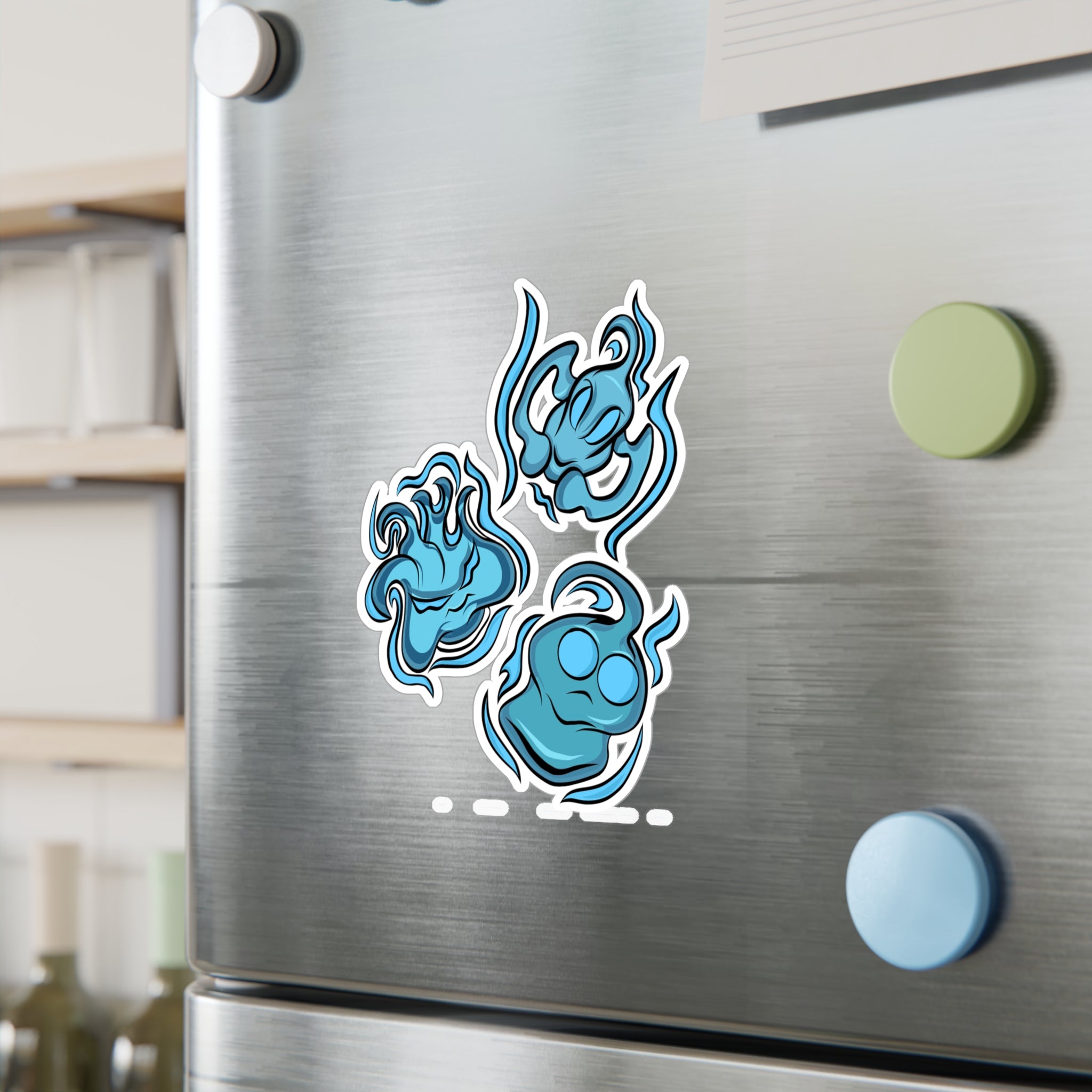 Bright, playful vinyl decals showing three whimsical blue spirits in a loose, hand-drawn style. The satin-finish stickers carry bold, saturated...